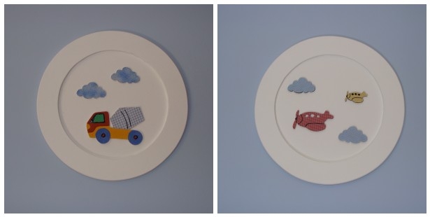 Eles foram feitos com sousplat redondo de mdf. Pintamos de branco e colamos os meios de transporte forrados com tecido.